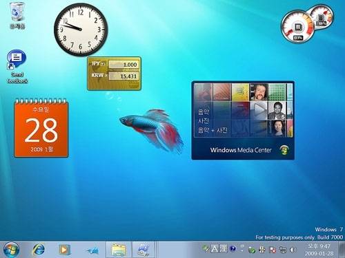 ① 개선된 UI윈도우7의 UI는 보다 개선됐다. 비스타의 사이드 바가 없어졌고 시계나 날씨 등 원하는 각종 가젯류를 배경화면 어디든 놓을 수 있게 됐다. '빠른실행' 도구는 따로 빠져나와 있는 것이 아니라 작업표시줄에 그대로 녹아들었다.