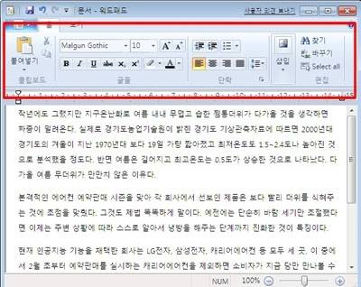 워드패드와 그림판 등 기본 프로그램에 리본인터페이스가 적용되어 각종 메뉴의 접근성이 높아졌다. |