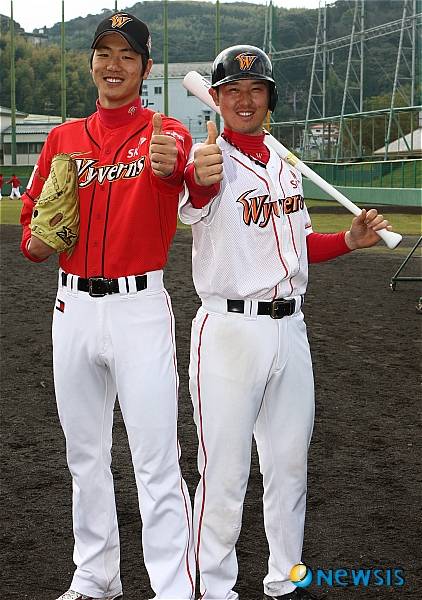 지난 10일 일본 고지에서 전지훈련 중인 SK 김광현과 최정이 카메라를 향해 포즈를 취하고 있다.(사진=SK 와이번스 제공) /허상욱기자 wook@newsis.com