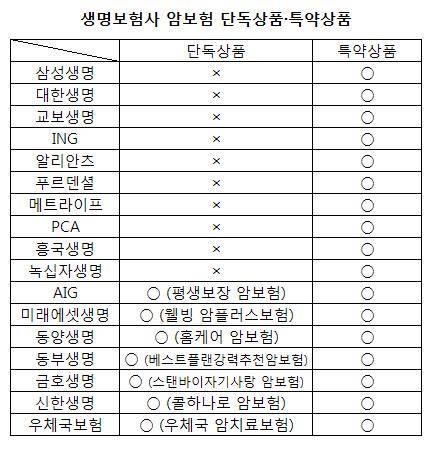 삼성생명과 대한생명, 교보생명, ING생명, 알리안츠생명 등 대형 생명보험사들은 단독 암보험 상품을 팔지않고 있다. 흥국생명도 지난해 11월부터 단독 암보험 상품판매를 중단하고 종신보험에 암보험 특약을 더해 판매하고 있다.