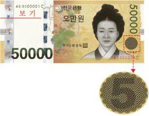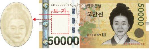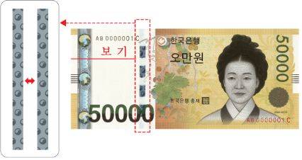 ▲숨은은선(security thread)초상 오른쪽에 숨겨져 있는 특수 필름 띠로서 빛에 비추어 보면 그 위에 문자와 액면 숫자("한국은행 BANK OF KOREA 50000")가 보인다.