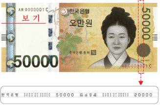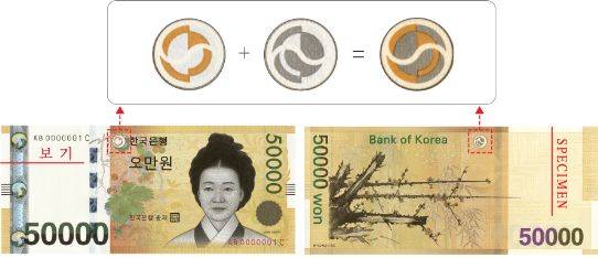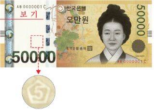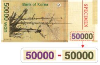 ▲ 색변환잉크(CSI; color shifting ink)뒷면 오른쪽 액면숫자("50000")에 특수잉크를 사용하여 이 숫자의 색상이 은행권의 기울기에 따라 자홍색(magenta)에서 녹색(green) 또는 녹색에서 자홍색으로 변한다.