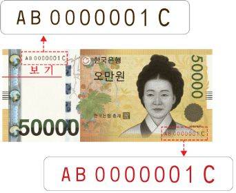 ▲가로확대형 기번호(serial number)기번호 10자리의 문자와 숫자의 크기가 오른쪽으로 갈수록 커진다.