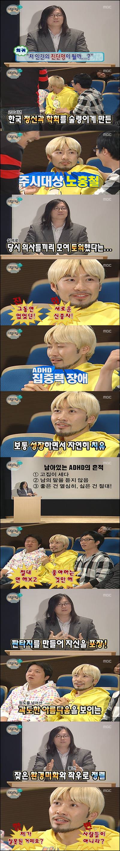 이어 송 전문의는 "노홍철의 정신상태를 진단하기 어려웠으나 아이들을 보다보니 감이 오기 시작했다"며 "노홍철씨는 ADHD(주의력결핍 과잉행동장애)로 굉장히 산만하다. 자라면서 그런 부분이 어느 정도 없어지는데 문제는 버릇이 남아있다는 것이다"고 말했다.