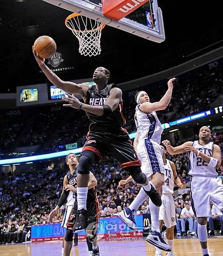 epa01671607 Miami Heat Guard Dwyane Wade (L) drives and shoots against the New Jersey Nets in the first half at Izod Center in East Rutherford, New Jersey, USA, 20 March 2009. EPA/PETER FOLEY CHINA OUT CORBIS OUT < WBC의 생생 현장! 3210 + 무선인터넷키 >