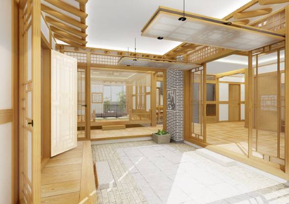 한옥 디자인 얼개를 보면, 한옥의 외관과 내부 살림 공간의 구조를 아파트에 적용한 것은 물론 구릉지의 특성을 그대로 살려 전통 마을의 조성 원리에 따라 단지를 배치한 것이 특징. 단지 입구에 마을 숲을 가꿔 외부 시선을 차단하고, 3개 동마다 마을 마당과 마을 사랑방을 두어 장터 또는 마을 모임을 열 수 있도록 했다.