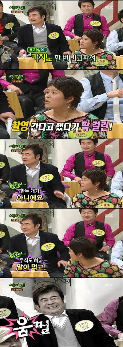 이에 이경실은 "한증막에서 화투치냐"고 조혜련을 다그쳐 출연진을 폭소에 빠뜨렸다.조혜련-김현기 부부는 아직 부부싸움의 앙금이 남은듯 "녹화 전 작가에게 '사이가 안좋은데 어떻게하냐'고 물었더니 '연기를 하라'고 하더라"며 티격태격하는 모습을 보였다.