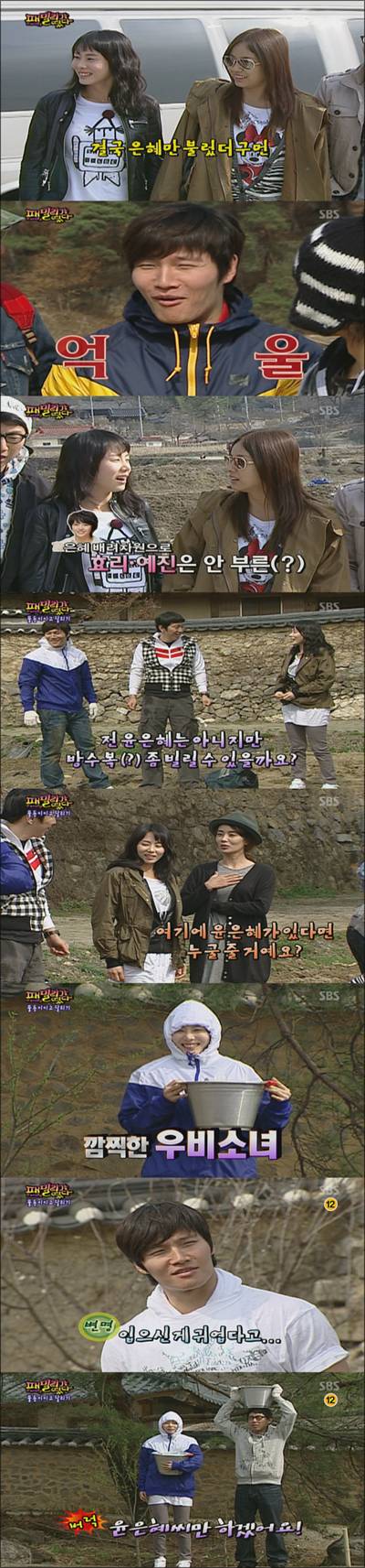물이 가득 든 양동이를 머리에 이고 달리는 게임이 하던 중 박예진은 자신의 차례가 되자 김종국에게 "제가 윤은혜씨는 아니지만 방수복 좀 빌릴 수 있을까요?"라고 짓궂게 물었다. 박예진이 김종국의 옷을 우비삼아 입자 김종국이 "생각보다 귀엽다"고 칭찬했다.
