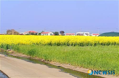 유채꽃밭과 보리밭, 그리고 단정한 마을집이 어울린 모습이 이국적인 느낌을 물씬 자아낸다. /김선아기자 avatar73@newsis.com