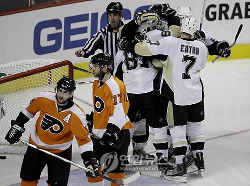 epa01704696 Members of the Pittsburgh Penguins celebrate a goal by Sidney Crosby as Philadelphia Flyers Simon Gagne (l) and Ryan Parent (c) skate away during the second period of their NHL Eastern Conference playoff ice hockey game at the Wachovia Center in Philadelphia, Pennsylvania, USA on 21 April 2009. EPA/CHRIS GARDNER CORBIS OUT