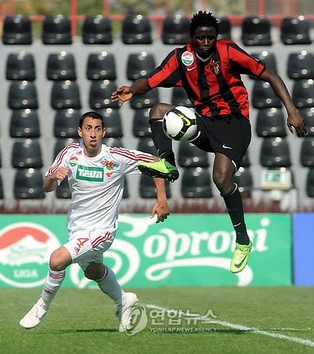 epa01724962 Midfielder from Ivory Coast Guie Gneki Abraham (R) of Budapest Honved tries to control the ball as Leandro of Debrecen VSC looks on during their Hungarian soccer league championship match in Bozsik Jozsef stadium of Honved in Budapest, Hungary, 09 May 2009. Debrecen won 1-0. EPA/IMRE FOELDI HUNGARY OUT .