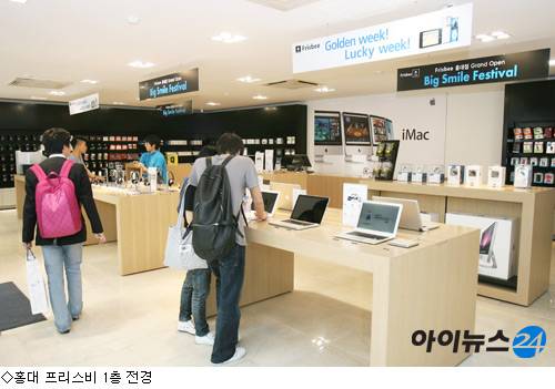 홍대입구역에서 홍대 정문으로 올라가는 길에 자리잡은 프리스비 매장에 들어서자 푸른색 반팔 티셔츠를 맞춰 입은 점원들이 반갑게 맞는다. '원반던지기'란 뜻의 이름처럼 프리스비는 젊고 역동적인 분위기 속에서 반짝반짝한 애플 아이팟과 맥북 신제품이 고객들을 유혹한다.