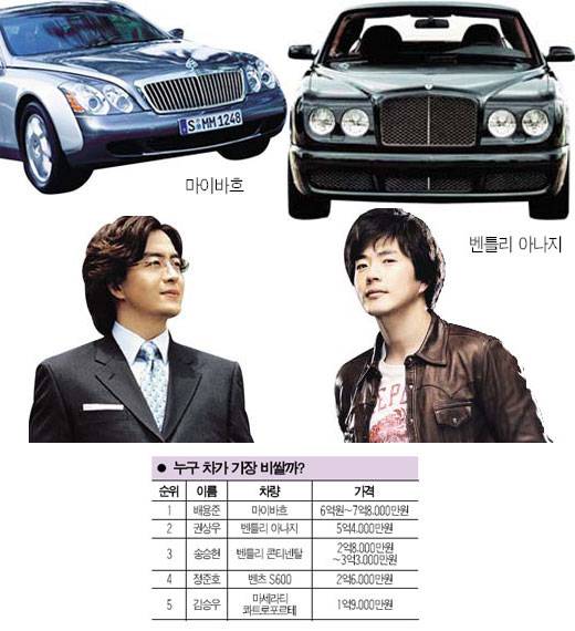 배용준 권상우와 절친한 사이인 배우 송승헌 역시 벤틀리를 탄다. 송승헌이 고른 모델은 컨티넨탈GT. 3억원이 넘는 고가 차량이다. 이 외에 소지섭과 김승우가 각각 재규어와 마세라티의 모델을 타는 것으로 알려졌다. 한 연예 관계자는 "몸이 재산인 연예인들은 가격이 조금 비싸도 안전성이 높은 차량을 선택하는 경향이 있다. 또한 세금을 줄이기 위해 외제차를 리스해 타기도 한다. 톱스타 중에는 차를 여러 대 보유한 이들도 많아 딱 꼬집어 한 브랜드를 탄다고 말하기 힘들다"고 귀띔했다.