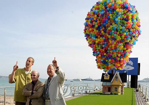 프랑스 가수 겸 배우 샤를 아즈나부르(중앙)가 2009년 5월 13일 남불(南佛) 칸에서 픽사르 만화영화 "업(Up)"을 홍보하기위한 포토콜에 참가하고 있다. 좌측는 피트 닥터 감독, 우측은 이그제큐티브 프로듀서 존 래시터(EPA=연합뉴스).(hcs). (paulohan@naver.com).