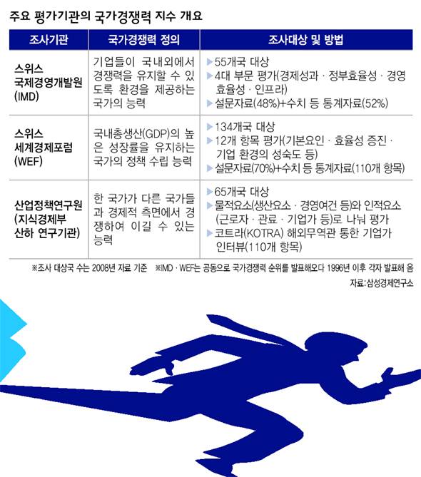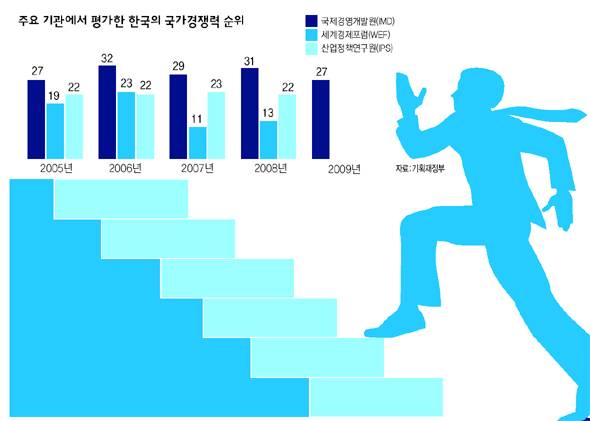 국제경영개발원은 지난 20일 '2009년 세계 경쟁력 평가' 보고서를 발표했다. 57개국을 대상으로 네가지 부문(경제성과·정부 효율성·경영 효율성·인프라)을 평가했는데, 우리나라는 종합 27위로 지난해(31위)보다 네 계단 상승했다. 국가 경쟁력 순위 발표는, 두 기관 말고도 미국 해리티지재단의 '경제자유도 조사', 유엔개발계획(UNDP)의 '삶의 질 조사'처럼 특정 분야만 집중하는 경우도 있다.