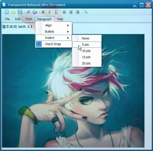 [쇼핑저널 버즈] 명령 프롬프트 창을 투명하게 바꾸는 Glass CMD와 비슷하게 Transparent Notepad는 투명 효과를 적용한 메모장 대체 유틸리티입니다. 리치 텍스트 편집을 지원하며 Unod/Redo, 이미지 삽입이 가능하고 한글 입력도 아무 문제 없습니다. 따로 에어로 효과를 쓰는 것이 아니라서 윈도 NT/2000/XP/Vista/7을 모두 지원하네요.