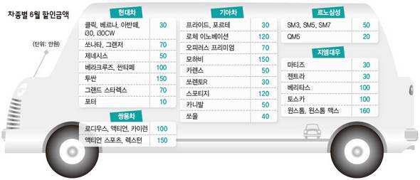 국내 완성차 업체들은 이런 틈을 타 할인조건을 지난달보다 많이 줄였다. 현대차는 저리 할부 제도를 없애고 대부분의 차종에 대해 현금 할인액도 축소했다. 예를 들어 싼타페와 베라크루즈 등에 대한 현금 할인액은 지난달에 150만원이었는데 이달에는 100만원으로 50만원 줄어들었다. 쏘나타 트랜스폼과 그랜저, 그랜드 스타렉스는 지난달에 100만원을 할인해 줬는데 이달에는 70만원만 할인해 준다. 하지만 4~7년 미만 차량 보유고객에 대한 10만~30만원 지원 이벤트는 유지하고 7년 이상 노후차 보유고객에 대해서도 20만~50만원 할인 혜택을 제공한다. 케이티(KT)와 함께하는 '쿡&쇼 제휴이벤트'는 좋은 기회다. 쿡 인터넷과 티브이, 이동통신 쇼 '현대차 요금제'를 동시에 가입하면 최대 100만원을 할인받을 수 있다.