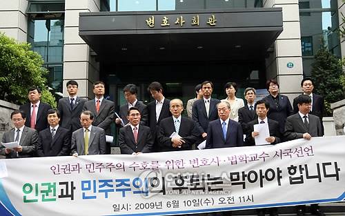 (서울=연합뉴스) 최재구 기자 = 10일 서초구 서울변호사회관 앞에서 박재승 변호사, 양승규 법학교수 등이 참여한 가운데 '인권과 민주주의 수호를 위한 변호사, 법학교수 시국선언'발표를 위한 기자회견이 열렸다. 참석자들은 시국선언문을 통해 "모든 문제의 원인과 책임은 인권과 민주주의를 경시해온 정부의 독선적인 국정운영 기조에 있다."며 "정부와 여당은 민주주의를 후퇴시키고 국민 기본권을 침해하는 정책과 행동을 중지하라."고 촉구했다. 2009.6.10
