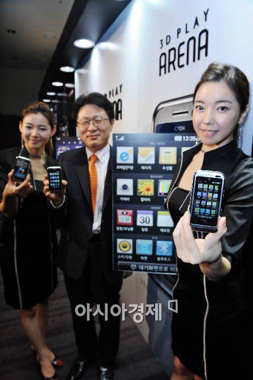 LG전자가 11일 오전 서울 프라자호텔에서 3차원 큐브 콘셉트의 'S클래스 UI'를 적용한 프리미엄 터치폰 '아레나폰'을 선보이고 있다. 이날 MC사업본부장 안승권 사장과 모델들이 '아레나폰'들고 포즈를 취하고 있다.