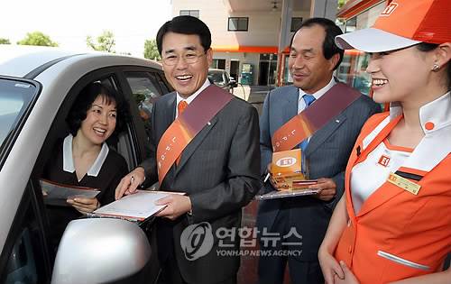 (과천=연합뉴스) 한상균 기자 = 주식회사 E1 구자용 부회장이 12일 오전 과천LPG 충전소에서 'E1 오렌지카드' 홍보활동을 하고 있다. LPG 전문기업 E1은 올해 4월부터 멤버쉽 포인트카드인 오렌지카드를 출시했다. 이 카드는 기존 정유사 카드 혜택은 물론 LPG용 보험 및 경정비 서비스 등을 제공한다. 적립포인트는 전국 이마트, CGV, 프로스펙스 등에서도 사용 가능하다. 2009.6.12