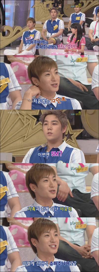 이어 "소속사 이수만 사장님께서 '너흰 SM주니어야'라고 말씀하시며 팀명을 그렇게 불렀다"고 말했다. 그는 "하루는 야유회가서 이수만 사장님이 저희들이 준비한 퍼포먼스를 보시더니 '너희는 다 잘 하는 구나! 이제부터 슈퍼주니어해라'라고 하셔서 슈퍼주니어가 됐다"고 밝혔다.