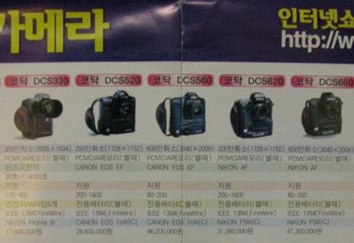 고화소, 고화질로 극찬 받던 니콘 D1을 넘어선 이 600만 화소짜리 카메라의 가격은 자그마치 4,700만원. 미국 판매 가격도 4만 달러에 달했다. 그 뿐 아니라 코닥의 하위 모델인 DCS 620이나 560 같은 제품도 2,000∼3,000만원은 가뿐히 넘겼다.