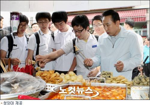 이명박 대통령이 길거리 한복판에 출현했다.하늘색 점퍼 차림의 이 대통령은 25일 대형마트와 기업형 슈퍼마켓(SSM)의 진출로 어려움을 겪고 있는 서울 이문동 한국외국어대 인근 골목상가를 누비며 구멍가게에서 뻥튀기를 사먹고, 떡볶이집에서 '오뎅'을 집어먹고, 빵집에서 크림빵을 한 입 베어 물었다.