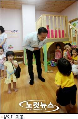 다음 장소는 센터 1층의 구립어린이집.이 대통령은 아이들을 안아주고 아이들과 배꼽에 손을 대고 인사하는 '배꼽인사'를 나누기도 했다.