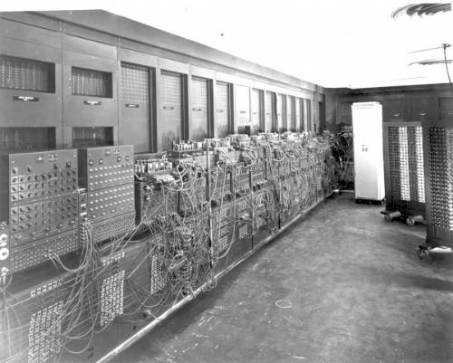 한쪽 벽면을 가득 채운 최초의 컴퓨터인 에니악. 케이스라기 보단 부품 보관 책장 같은 느낌이다. |
