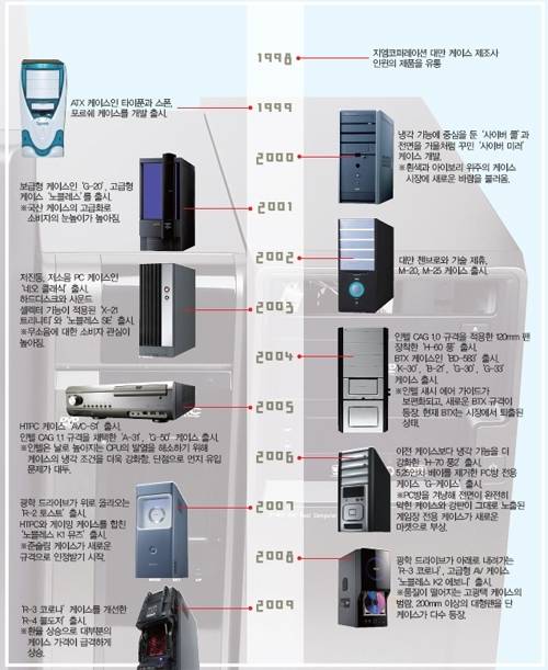 ■ PC 케이스의 변화초기의 모습이 거의 변하지 않은 다른 부품과 다르게 PC 케이스는 많은 변화를 겪어왔다. 특히 케이스 크기의 변화는 엄청나다. 최초의 컴퓨터 케이스와 요즘 유행하는 슬림 케이스를 비교해보면 어마어마한 크기 차이에 놀라기 마련이다. 최초의 케이스부터 현재의 미니 케이스까지 어떤 변화가 있었는지 PC 케이스의 변화에 대해 살펴보자.