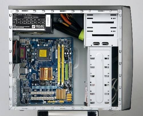 GMC 'H-70 풍2' 케이스에 기가바이트 'EP45-UD3R' ATX 메인보드를 얹었다. 메인보드와 파워 서플라이를 달고 나면 공간이 별로 남지 않는다. 요즘엔 파워 서플라이를 앞에 달아 공간 효율을 높인 미들 타워도 보이지만 열에 약한 약점이 있어 아직은 좀더 지켜볼 때다. |