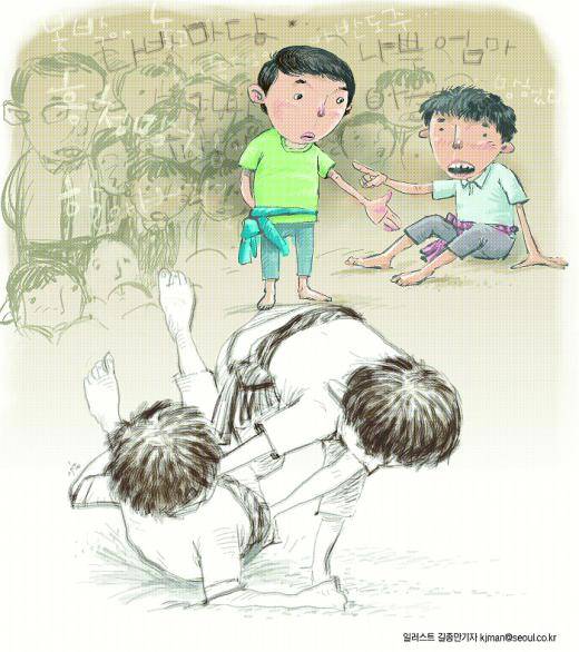 지한이는 지지 않으려고 안간힘을 썼습니다. 그러나 영진은 지한의 발을 걸고 몸을 들어 한 바퀴 빙 돌린 뒤 모래판에 내동댕이쳤습니다.