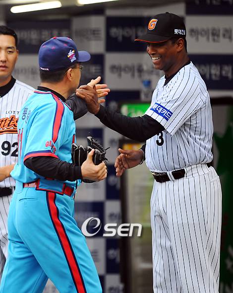 경기 전 시구행사에 참석한 전 롯데 자이언츠 1984년 우승 주역인 현 한국야구위원회 경기운영위원 최동원이 로이스터 감독과 하이파이브를 하고 있다./부산=윤민호 기자ymh@osen.co.kr