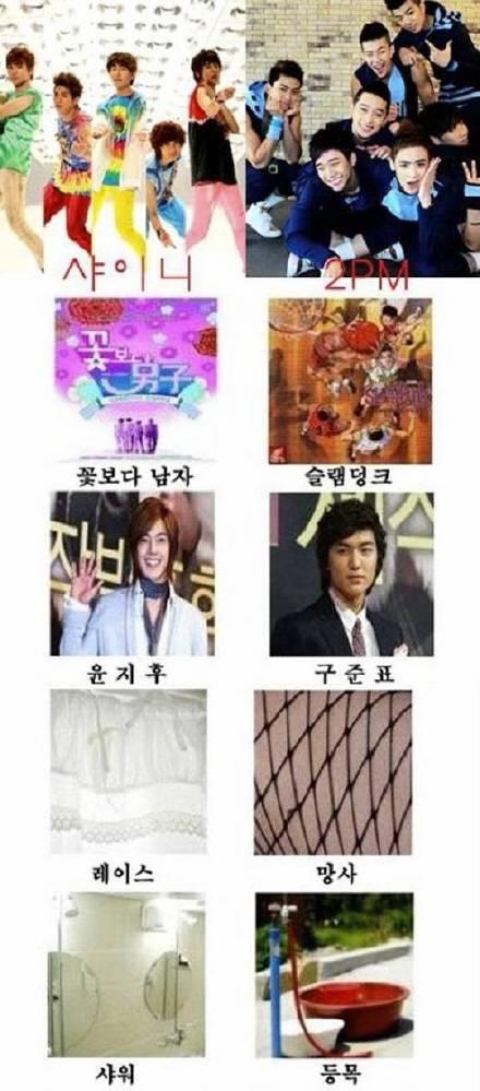 샤이니가 '샤워볼', '꽃보다 남자', '와인', '알프스' 등의 이미지와 중첩된다면 2PM은 '때수건', '슬램덩크', '소주', '세렝게티'가 연상된다는 것. 앞에 열거된 단어의 이미지를 종합해보면 샤이니는 '부드러움'과 '낭만'이, 2PM은 '거침'과 '힘' 등으로 점철된다는 것을 알 수 있다.