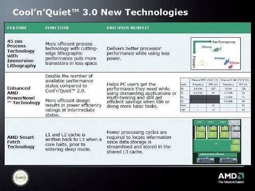 사실 AMD의 45nm 공정은 인텔보다 1년 가까이 늦게 적용되었다. 하지만 더 미세한 32nm 공정에 필수 적용될 기술로 알려진 이머전 리쏘그래피 기술을 적용하여 그 성능을 높였다.