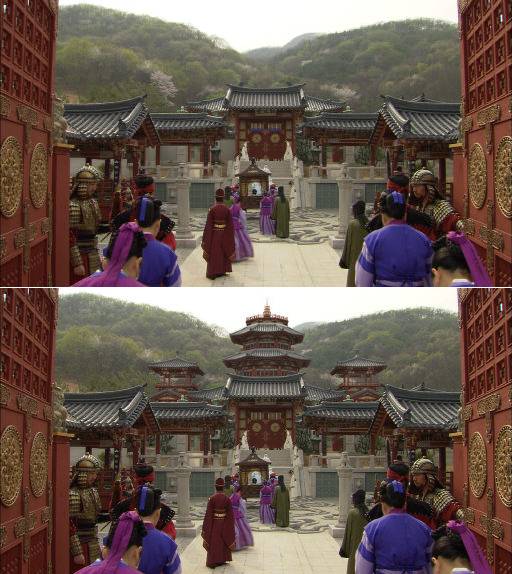 4회에서 문노가 제사를 올리기 위해 산에 오르는데, 실사 장면에선 산 아래로 각종 비닐하우스와 공장이 즐비했다. CG팀은 실제 배경을 지우고 그 위에 서라벌 전경을 덧입혔다.