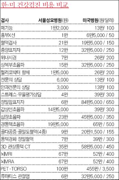 미국에서 같은 수준의 건강검진을 받는다면 1만5,000~2만달러(1,950만~2,600만원)를 지불해야 한다. 1박2일 동안 숙박검진을 받은 진씨는 미국의 5분의 1 수준에도 못 미치는 검진비로 친절한 서비스와 정확한 검사를 받은 것에 흡족해 했다.