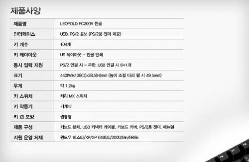 레오폴드 FC-200R 사양키 스위치가 독일 체리 MX 제품을 채용하고 있어 내구성과 신뢰를 더합니다. 내부에는 금속 보강판 처리가 되어 있다고 하네요. 가격은 14만 5,000원으로 하이엔드급 키보드에 속합니다. 무엇보다도 키보드를 눌렀을 때 느껴지는 경쾌한 키감이 이 키보드의 매력이라고 생각합니다.