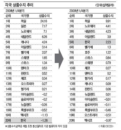 작년만 해도 한국의 처지는 크게 달랐다. 지난해 1/4분기만 해도 우리나라 상품수지는 12억6000만달러 적자였다. 이 기간 수출액은 345억4000만달러였지만 수입액이 358억달러에 달하면서 많은 적자를 냈었다. 당시 상품수지 실적은 30개 OECD 회원국 가운데 20위에 그쳤었다.