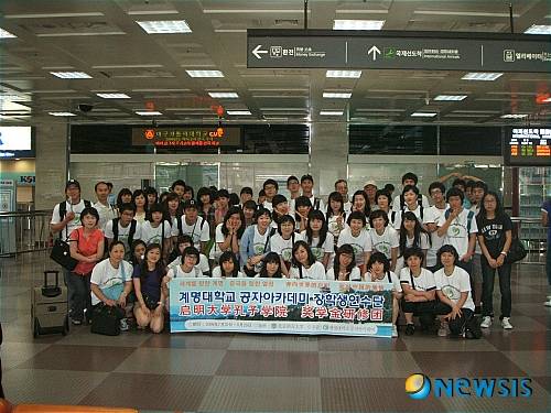 【대구=뉴시스】나호용 기자 = 계명대 공자아카데미가 실시하는 중국정부(교육부) 지원 단기장학생연수단과 중국어교사현지연수단이 20일 대구공항에서 출정식을 갖고 북경으로 출국했다.