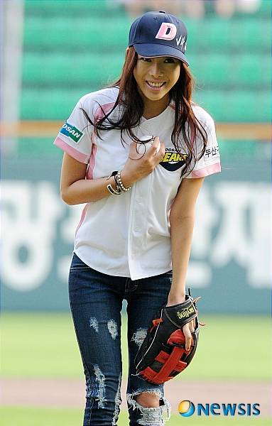 【서울=뉴시스】이동원 기자 = 21일 오후 잠실야구장에서 열린 2009 프로야구 두산베어스-롯데자이언츠 경기에서 가수 혼성그룹 '에이트'의 주희가 승리기원 시구를 하고 있다.