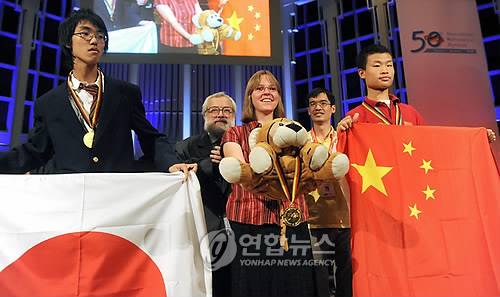 epa01801440 (L-R) Makoto Soejima from Japan, 16 year-old Lisa Sauermann from Dresden, Germany and Dongyi Wei from China, are honoured as the three best particpants in this year's Mathematics Olympics (IMO) in Bremen, Germany, 21 July 2009. Some 565 pupils from 104 nations took part in the competition. EPA/INGO WAGNER < 실시간 뉴스가 당신의 손안으로..연합뉴스폰 >< 포토 매거진 >< 저작권자(c)연합뉴스. 무단전재-재배포금지. >