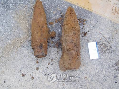 (천안=연합뉴스) 이우명 기자 = 충남 천안시 서북구 두정동 1번국도 상수도 터파기 공사현장에서 한국전쟁 당시 매몰된 것으로 보이는 직경 75㎜ 고폭탄 2개가 발견됐다. 2009.7.24. lwm123@yna.co.kr