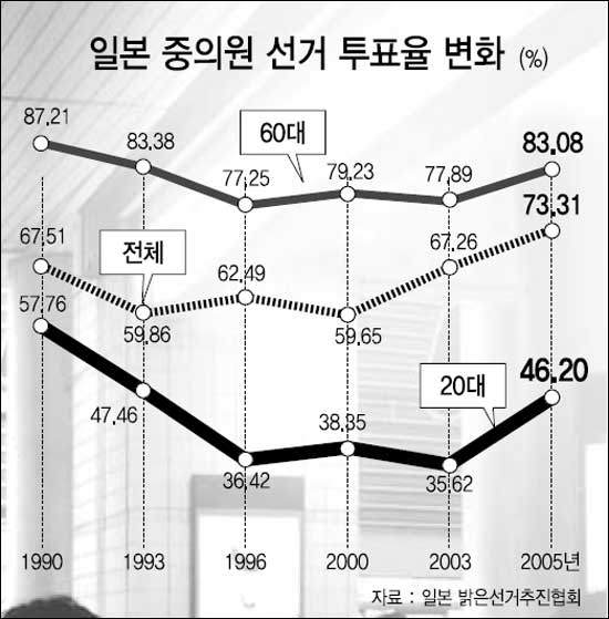 일본 시민단체 밝은선거추진협회가 집계한 투표율은 2007년 참의원 선거가 58.64%, 2005년 중의원 선거는 73.31%였다. 니혼게이자이(日本經濟)신문의 최근 여론조사에서 이번 총선에 투표하겠다고 답한 사람은 이미 90%를 넘었다. 정권교체 가능성이 높아 전후 가장 흥미진진한 선거 중 하나가 될 총선에서 일본 젊은이들이 어떤 활약을 할지 주목된다.