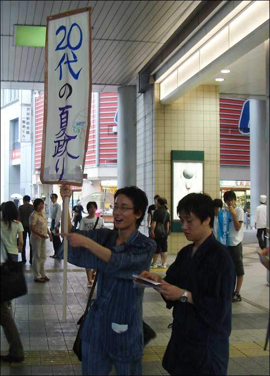 2일 도쿄(東京)에서 젊은이 거리로 유명한 시부야(澁谷)역 앞. 여름철 전통의상 유카타(浴衣)를 차려 입은 남녀 대학생들이 보슬비 내리는 휴일 번화가를 누비며 전단 나눠주기 바쁘다. 8월 30일 중의원 선거를 앞두고 학생 단체 '아이보트(ivote)'가 벌이는 20대 투표 참가 독려 캠페인이다.