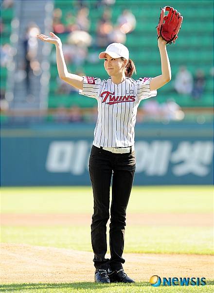 【서울=뉴시스】이동원 기자 = 16일 오후 잠실야구장에서 열린 2009 프로야구 LG트윈스-롯데자이언츠 경기에서 2009 미스코리아 김주리(진)가 시구를 하고 있다. 김주리가 야구팬들의 환호에 답하고 있다.