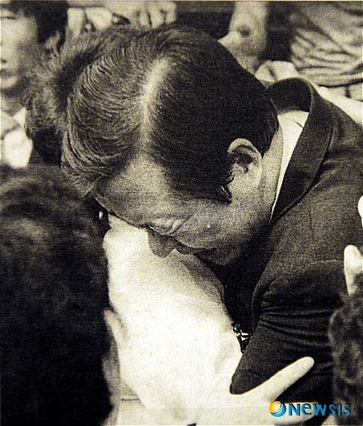 사진은 김대중 전 대통령이 1987년 광주 국립5.18민주묘지를 참배한 뒤 유가족과 오열하고 있는 모습.