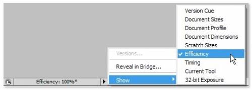 또 이미지를 열고 아래쪽의 문서 크기 나타내는 부분을 체크하면 Efficiency를 대신 표시할 수 있는데요. 이 값이 100%가 아니라면 포토샵에 메모리를 더 할당하면 할당할수록 작업 속도 역시 빨라질 수 있음을 나타냅니다. 물론 작업 중이지 않은 이미지와 다른 애플리케이션을 종료하는 것도 efficiency 향상에 도움이 됩니다.