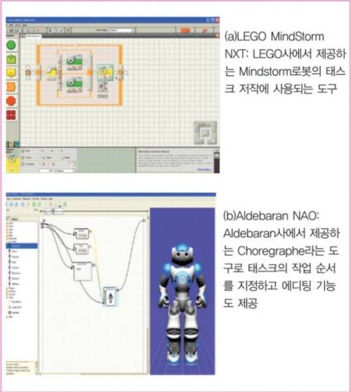 이러한 경우에는 c/c++처럼 컴파일이 필요 없기 때문에 사용하기 편리할 수는 있지만 센서 및 구동 장치와 이종의 언어를 사용하기 때문에 디버깅을 위한 별도의 도구를 제공되지 않는다면 디버깅 하기가 불편할 수 있다.■ 저작도구로봇 태스크 프로그램 작성시 텍스트 에디터를 이용하는 것이 아니라 다이어그램 방식의 저작 도구를 이용하여 사용자에게 보다 직관적이면서 작성하기 편리한 환경을 제공할 수 있다.