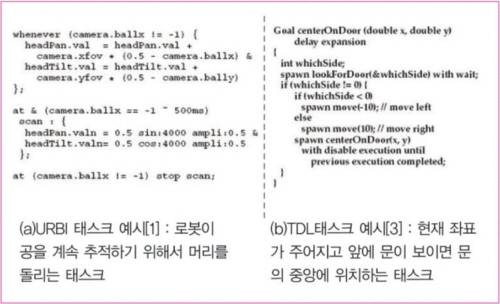 TDL 태스크를 여러 서브 태스크를 계층적으로 분해하여 정의한다. 그림 2는 URBI와 TDL의 태스크를 예시한 것이다.